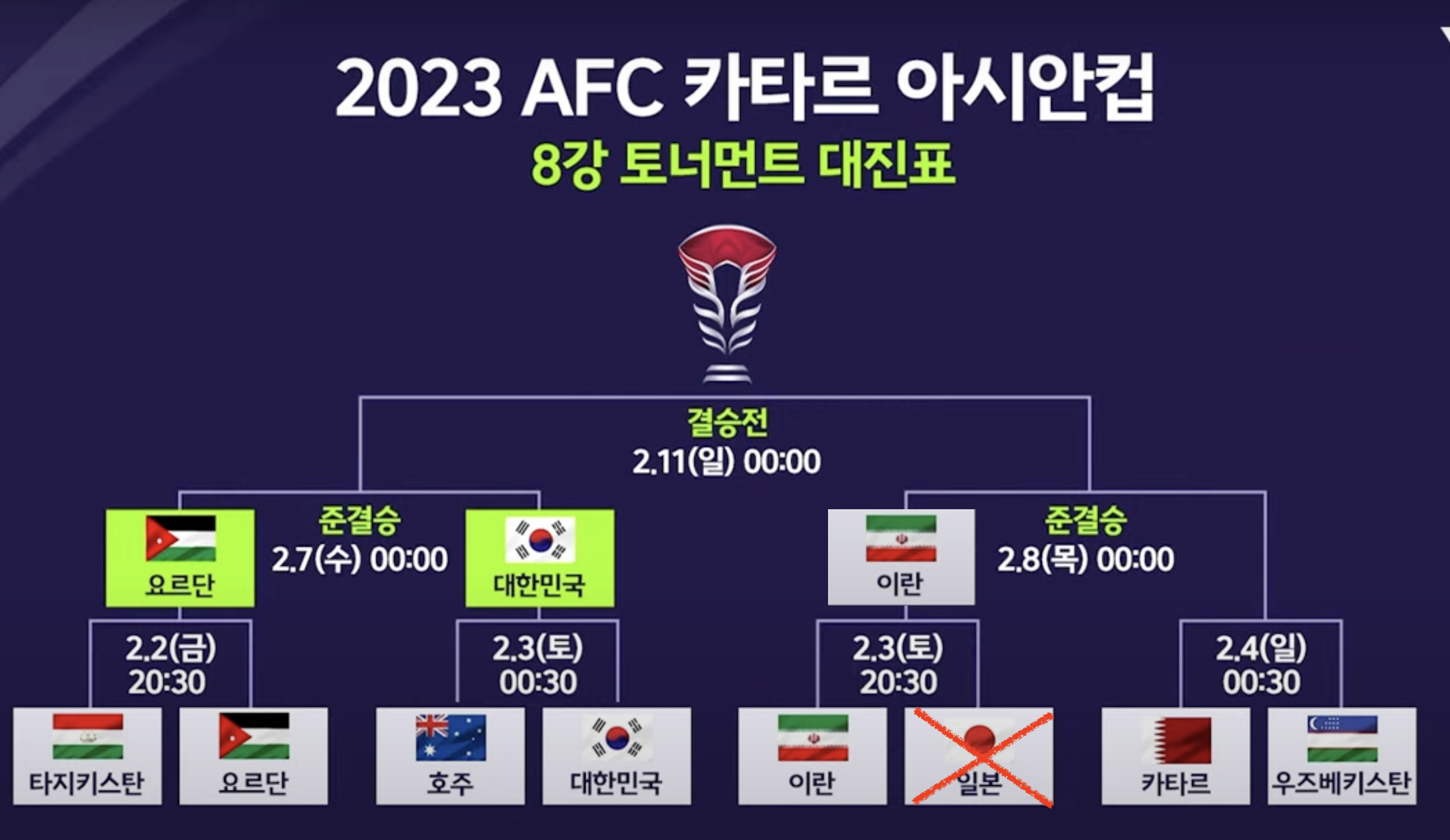 한국은 호주를 극적으로 이기며 다시한번 우승의 불씨를 지폈습니다. 한국과 요르단의 경기는 2월 7일 수요일, 저녁 12시에 진행될 예정이며 우리와 결승에서 만나길 기원했던 일본은 이란과의 8강 경기에서 패하며 안타깝게 8강에서 탈락하였습니다. 아쉽게도 한일전은 성사되지 않습니다. 과연 90분의 기적을 이뤄내고 있는 한국이 돌아오는 주 수요일, 요르단을 꺾고 토너먼트의 끝, 결승까지 올라갈 수 있을지 기대가 됩니다.