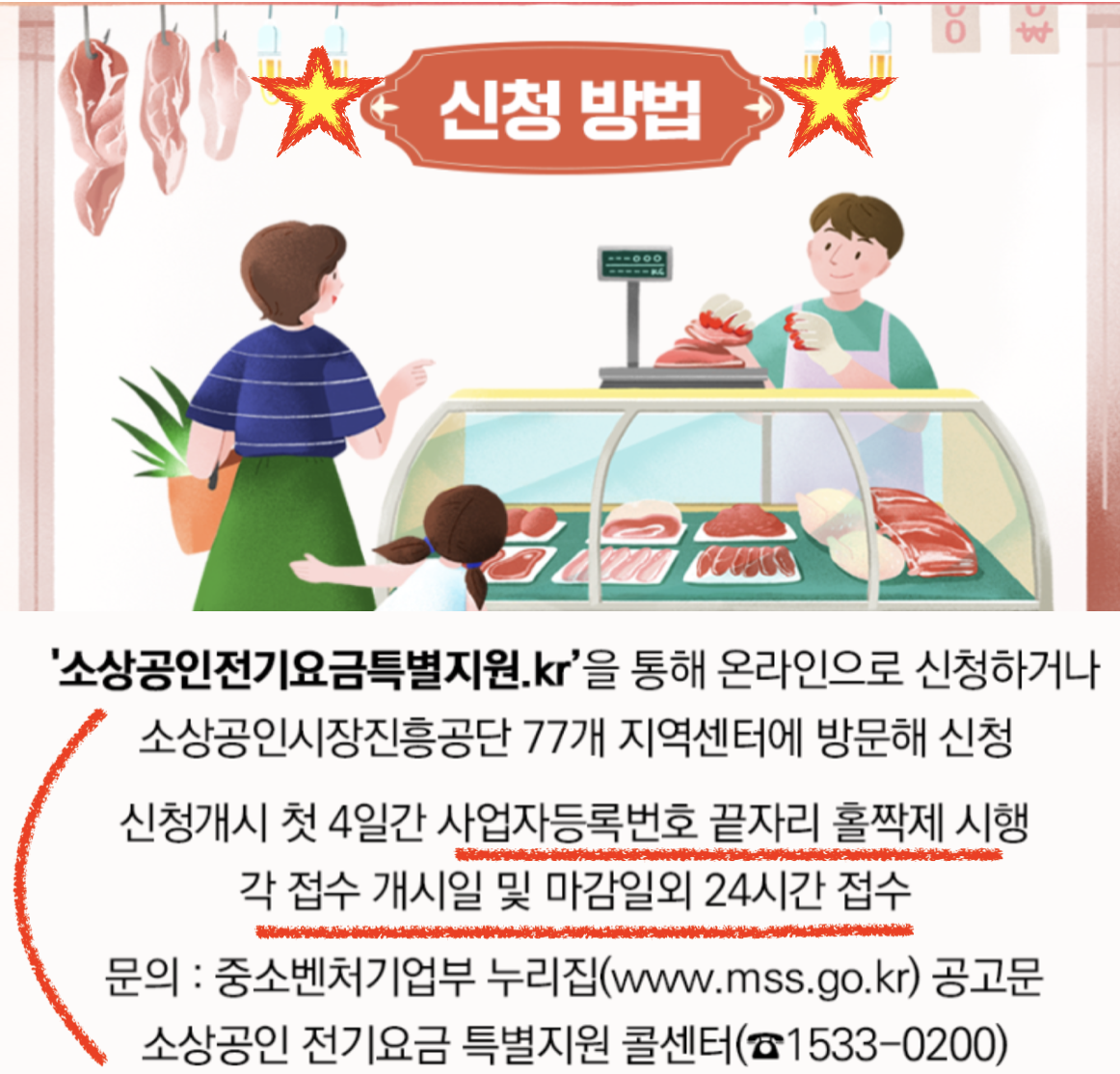 소상공인 전기요금 특별지원의 지원대상은 위와 같습니다. 개업일이 23년 12월 31일 이전이여야 하며, 연 매출액이 3000만원 이하인 영세 사업자여야 한다는 조건이 가장 필수적이며, 1인이 다수 사업체의 대표라도 그 사업체중 한곳만이 신청이 가능하며 공동대표가 운영하는 사업체라도 대표 1인만 신청할 수 있다라는 것을 잘 알고있어야할 것 같습니다.