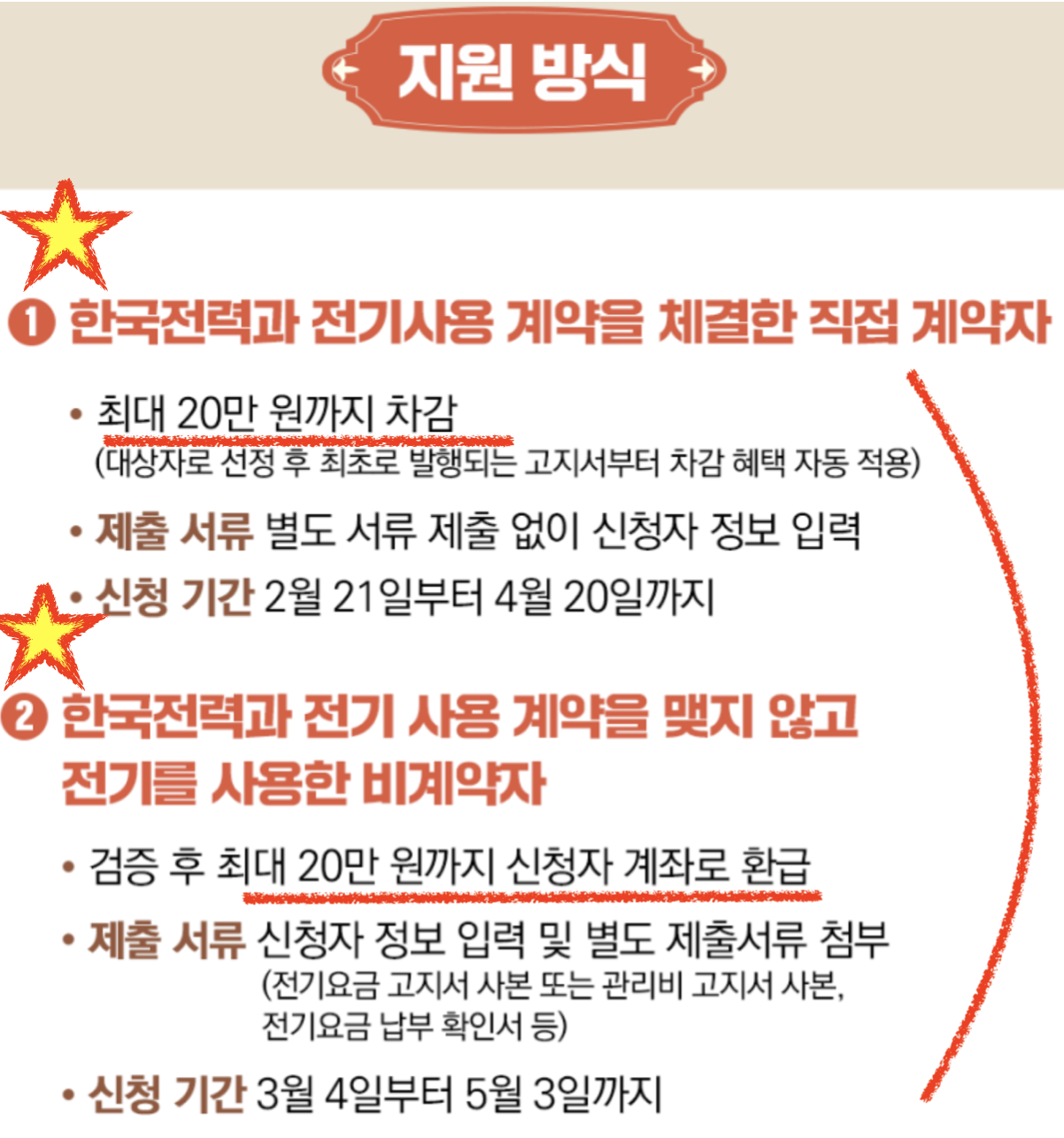 ✅ 그 외 타인과 함께 전기를 사용하나, 전기요금이 표기된 관리비 고지서 없이 직접 계약자와 자율 분담 사각지대 최소화 차원에서 비계약 사용자도 사업장용 전기사용 여부, 요금 납부를 확인할 수 있는 서류* 등을 별도로 검증해 납부 금액을 최대 20만 원까지 환급합니다.